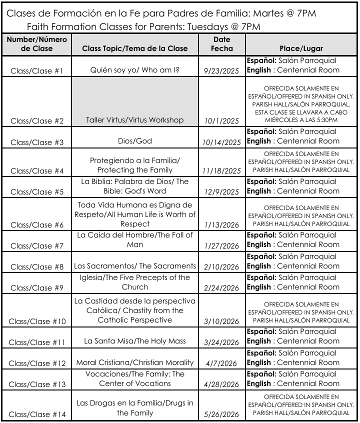 Parent Faith Formation Tuesdays Classes Calendar 2025-2026/ Calendario de Clases de los martes de Formación en la Fe para Padres de Familia 2025-2026