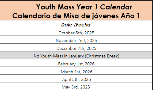 Youth Mass Calendar YEAR 1 2025-2026/ Calendario de Misa de Jóvenes AÑO 1 2025-2026