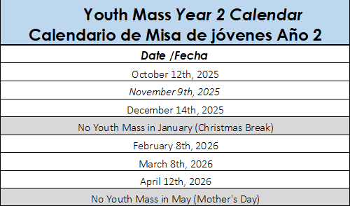 Youth Mass Calendar YEAR 2 2025-2026/ Calendario de Misa de Jóvenes AÑO 2 2025-2026